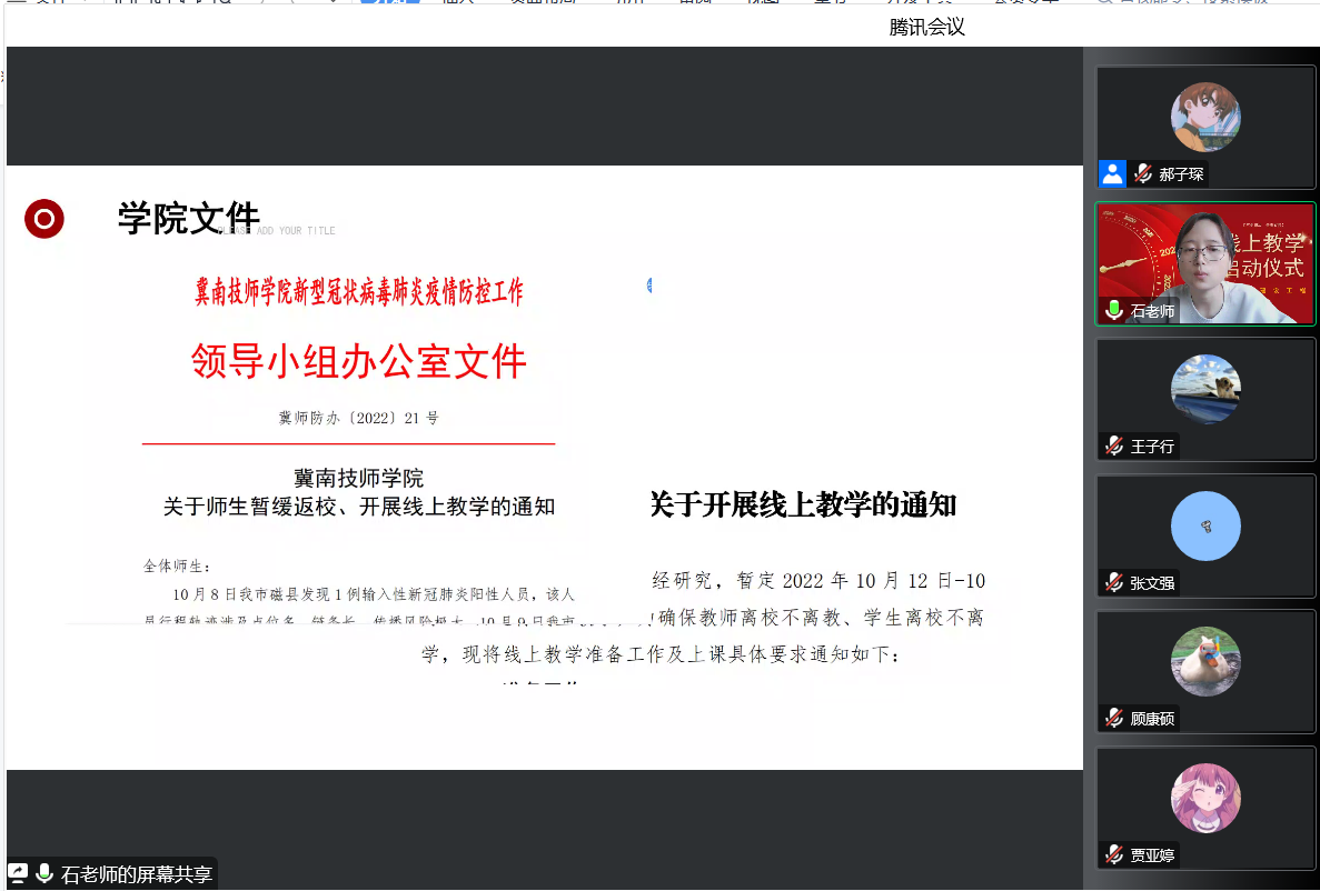 为了让同学们高度重视线上学习形式,保证线上学习质量,按时完成学习任务,真正实现防疫不停课,居家不停学目标。城市建设工程系于10月11日下午3点,举行线上教学启动仪式。本次启动仪式由郝子琛主持,系部主任石萌瑶、各班班主任和城建系全体学生参加了启动仪式。