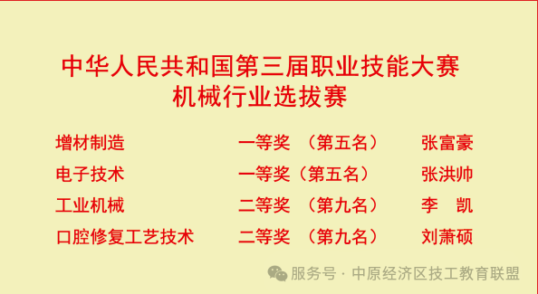 近日,中华人民共和国第三届职业技能大赛机械行业选拔赛圆满落幕。本次大赛涵盖了电子技术、增材制造、口腔修复工艺技术以及工业机械等多个赛项,吸引了来自全国各地的职业技能精英同场竞技,充分展现了精湛的技艺和卓越的专业素养。我院师生在此次大赛中表现优异,斩获了2个一等奖和2个二等奖的佳绩。