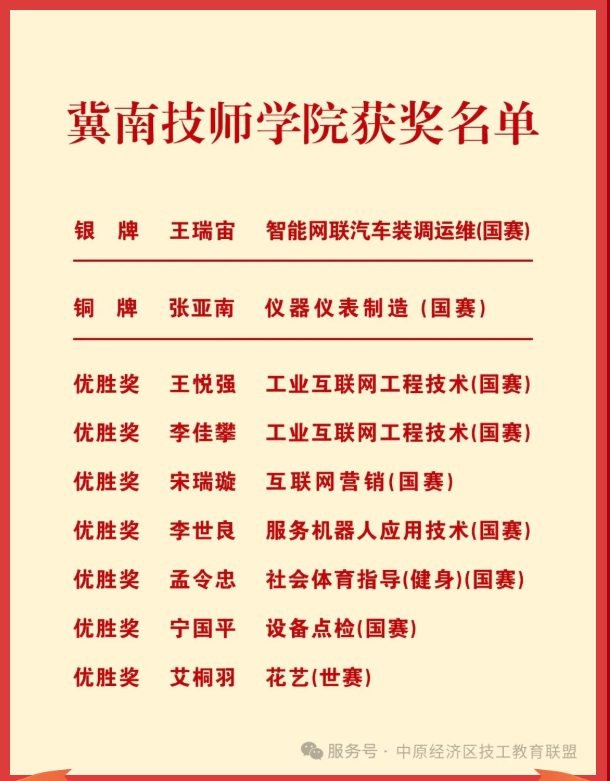 金秋九月,捷报传来!在9月19日至23日举办的第三届全国职业技能大赛上,冀南技师学院师生奋勇拼搏,斩获1银、1铜、7优胜的辉煌战绩,奖牌总数位列河北省参赛单位第一,助力邯郸市创造参赛历史最好成绩!