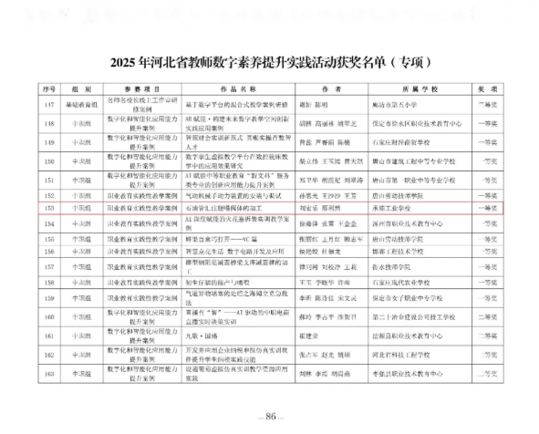 近日,在由河北省教育厅主办的“2025年河北省教师数字素养提升实践活动和教育技术论文评选活动”中,我校机械电气系的刘宏乐、邢利然两位教师凭借扎实的专业能力和创新实践精神,在职业教育实践性教学案例项目中荣获一等奖。