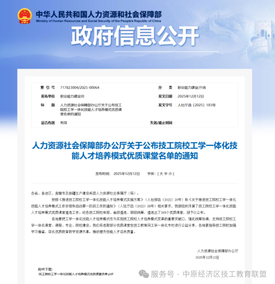 此次遴选工作严格按照《人力资源与社会保障部办公厅关于开展技工院校工学一体化技能人才培养模式优质课堂遴选工作的通知》要求,在全国技工院校工学一体化第一阶段、第二阶段建设院校及建设专业中开展,历经院校申报、省级遴选、部级统筹等多个环节,最终评选出369个优质课堂,我院申报的两个优质课堂全部入选。